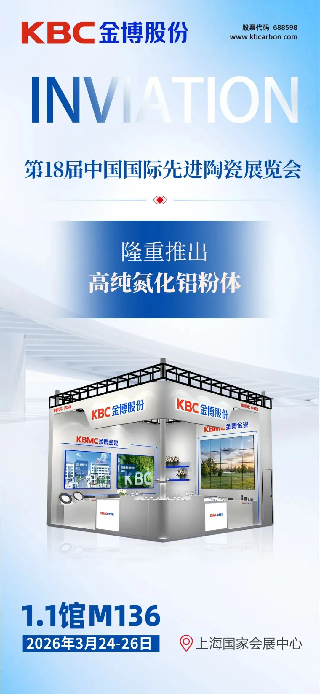 3月24日至26日,在上海国家会展中心举办的第18届中国国际先进陶瓷展览会,金博股份将携最新研发的高导热氮化铝陶瓷粉体新产品惊艳亮相,与行业专家及产业伙伴共同探讨先进陶瓷材料的发展趋势与产业机遇。