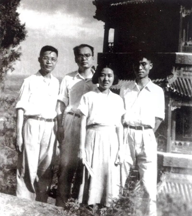顾诵芬(左一)、黄志千(左二)与同事们在沈阳(扫描自《我的飞机设计生涯》)