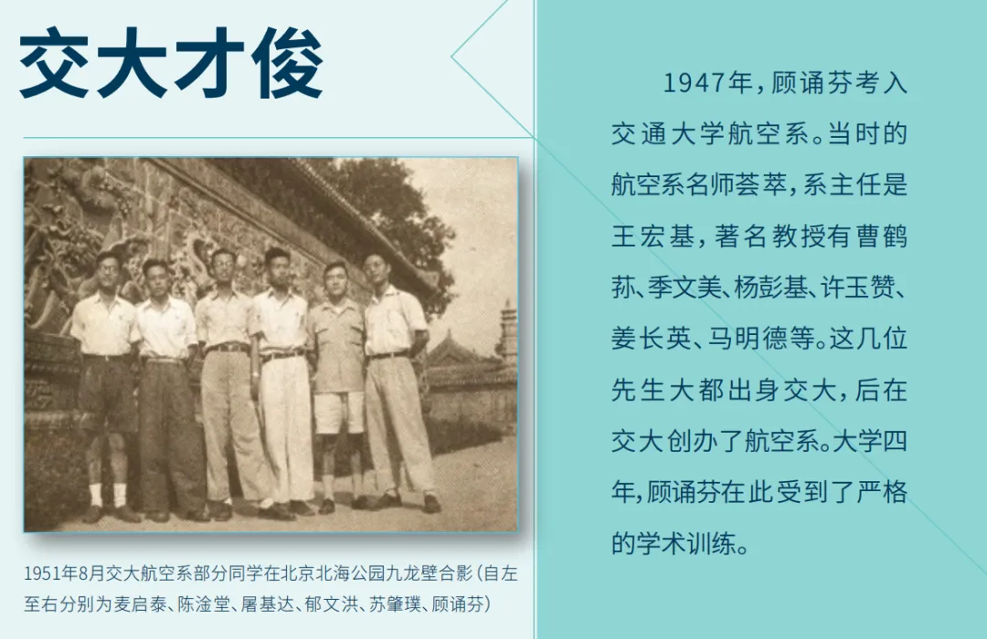 1944年,在季文美教授的倡议下,交大航空系成立了“交大航空模型研制会”,顾诵芬入学后曾任会长。在交大的学习为顾诵芬日后实现自己的空天梦想奠定了坚实的基础,如今每每念及母校,顾老总会感慨,“在参加我国的飞机事业中,我所以能够尽一些力量,饮水思源不得不感谢交大的老师和同学对我的帮助及交大当时教学制度给我的训练。”