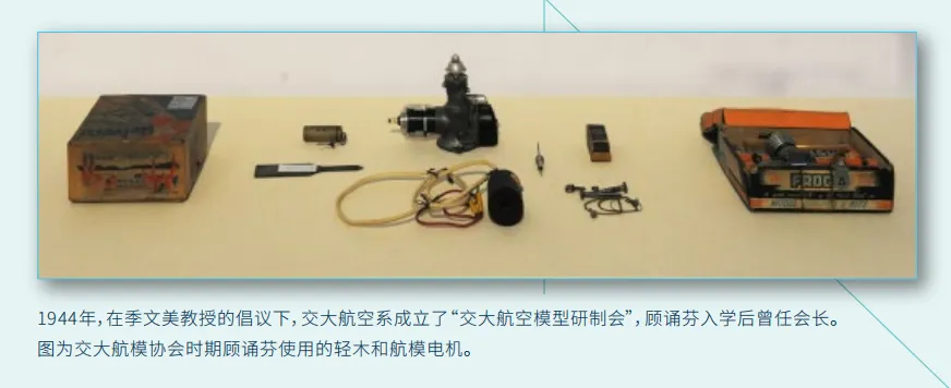 严格的学术训练中,顾诵芬忆起,“我觉得受益最大的,还是二年级。二年级最基本的两门课,一是应用力学,一是材料力学,这两门课都是航空系教授季文美先生教的。”在战火烽烟的1944年,在季文美倡议下,航空系成立“交大航空模型研制会”,顾诵芬就任会长,有图展示了这一时期顾诵芬使用的轻木和航模电机。