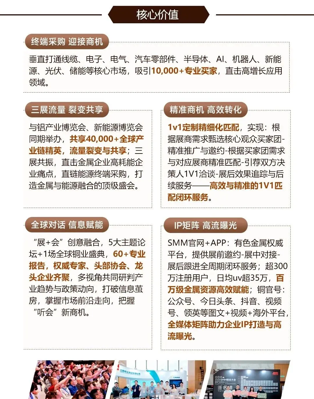 本届展会致力于搭建全球铜产业链交流与合作的平台,将汇聚来自世界各地的铜产业、学术以及行业组织代表,共同聚焦全球铜市场的新动态、铜价走势分析、供需平衡状况、商业合作机会以及技术革新等关键议题。我们将深入讨论如何推动铜产业朝着更环保、更高效、更可持续的方向发展。