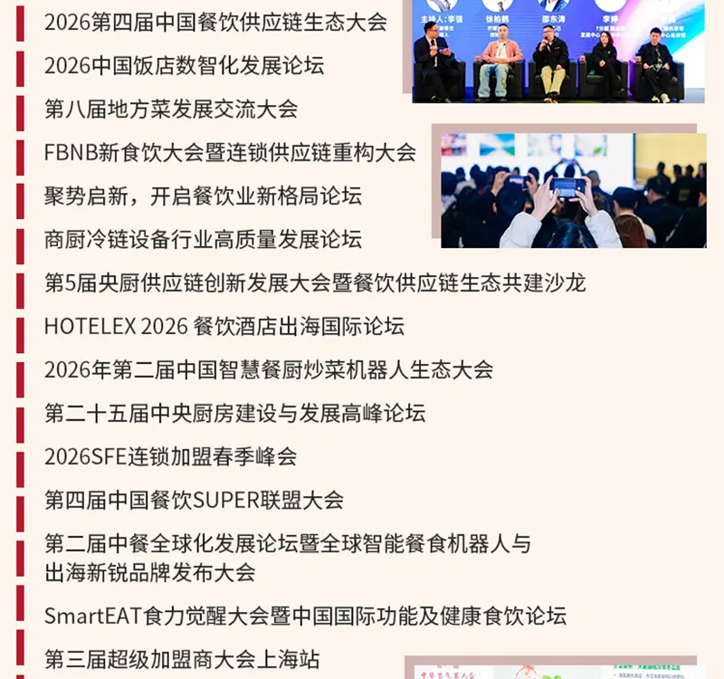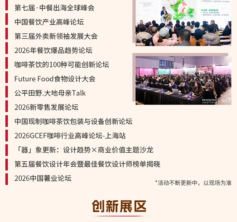 HOTELEX 2026第三十四届上海国际酒店及餐饮业博览会,将于2026年3月30日-4月2日在上海浦西·虹桥国家会展中心盛大举办!涵盖餐饮设备、桌面用品、食品饮料、咖啡茶饮、烘焙冰淇淋、轻餐美酒、食品机械、食品餐饮包装及机械、连锁加盟等热门板块,为全球酒店及餐饮业从业者创造一个更为开放和高效的交流空间。
