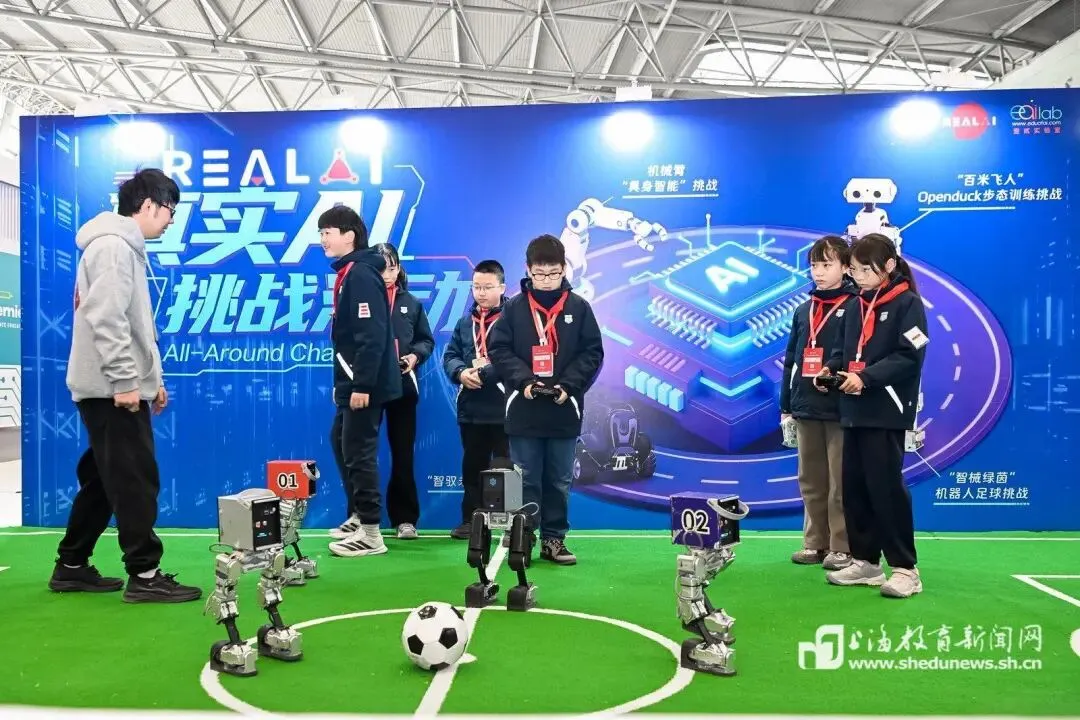 “我做了一个动作,机器人可以完全复刻出来,很神奇”“汽车模型如果调整好合适的速度,就不会发生碰撞,无人驾驶原来是这种操控方式”“机器人的操控模式很多,好有趣”……在博览会特别设置“AI实验室体验区”“综合实践活动体验区”里,呈现着教育装备专业发展及融合运用的案例场景,来自嘉定区安亭小学等学校的同学体验了“自动驾驶激光雷达赛车”“机器人足球”“具身智能机器人动捕”等项目,感受新技术、新装备在实际中的运用。