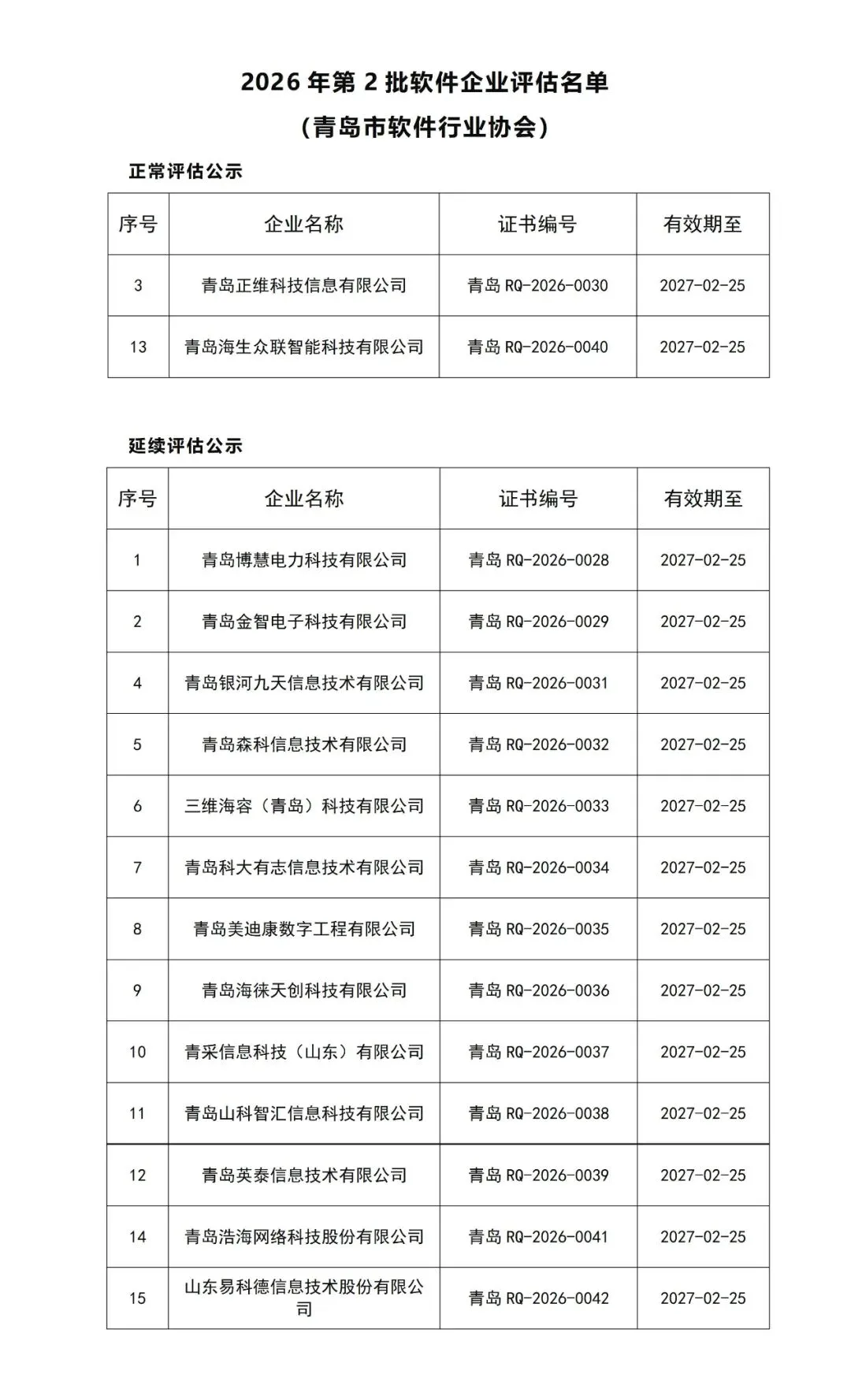 【青岛市软件行业协会】共15家企业:2026年第2批软件企业名单公布