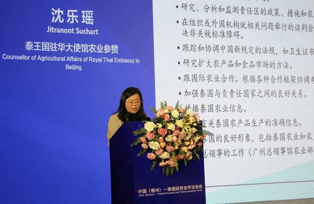 4月27日至28日,泰王国驻华大使馆农业处、泰王国驻青岛总领事馆商务处和中国泰国商会一行来我市考察访问。期间,德州市人民政府外事办公室和中国泰国商会共同主办了中国(德州)—泰国经贸合作洽谈会。洽谈会上,德州市人民政府副秘书长王洋致辞并从发展概况、产业生态、对接东盟等三个方面来介绍德州;泰王国驻华大使馆农业参赞沈乐瑶推介泰国农业产业情况;泰王国驻青岛总领事馆商务领事陈妮达介绍泰国贸易投资政策;市委组织部人才办推介人才政策;市农业农村局推介中国(德州)农业食品创新产业园情况。泰国盘古银行北京分行市场部经理、泰国汇商银行北京首席代表、泰国304工业园北京代表处相关负责人围绕各自优势进行了推介。我市共有34家企业参会,中泰双方就赴泰投资、产业配套、农产品国际认证、项目服务等问题进行了深入探讨和互动交流。