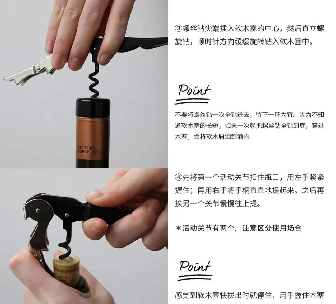 是一种最为常见的开瓶器小巧便捷,方便携带;但是新手刚拿到的时候很可能不知道卡位在哪里,也许需要多熟悉下才能更好地固定钻入位置和拔塞的卡位。