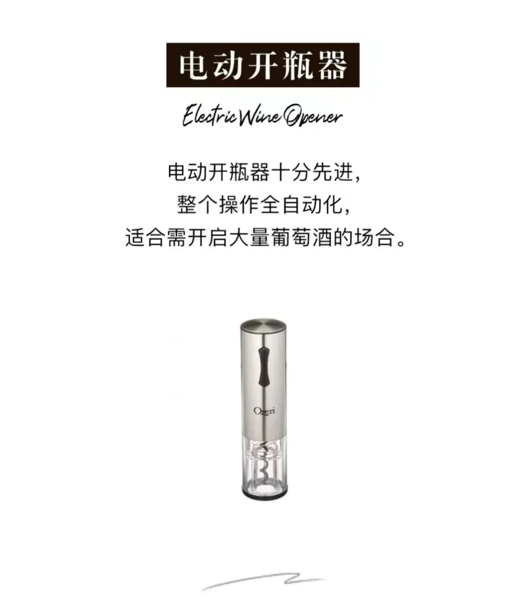 电动开瓶器是顺应需求而生的新产物。实现一键式开瓶,很方便。更受年轻人的喜欢,但是弱化了本身葡萄酒开瓶的优雅和仪式感,而且要小心没电了哦!