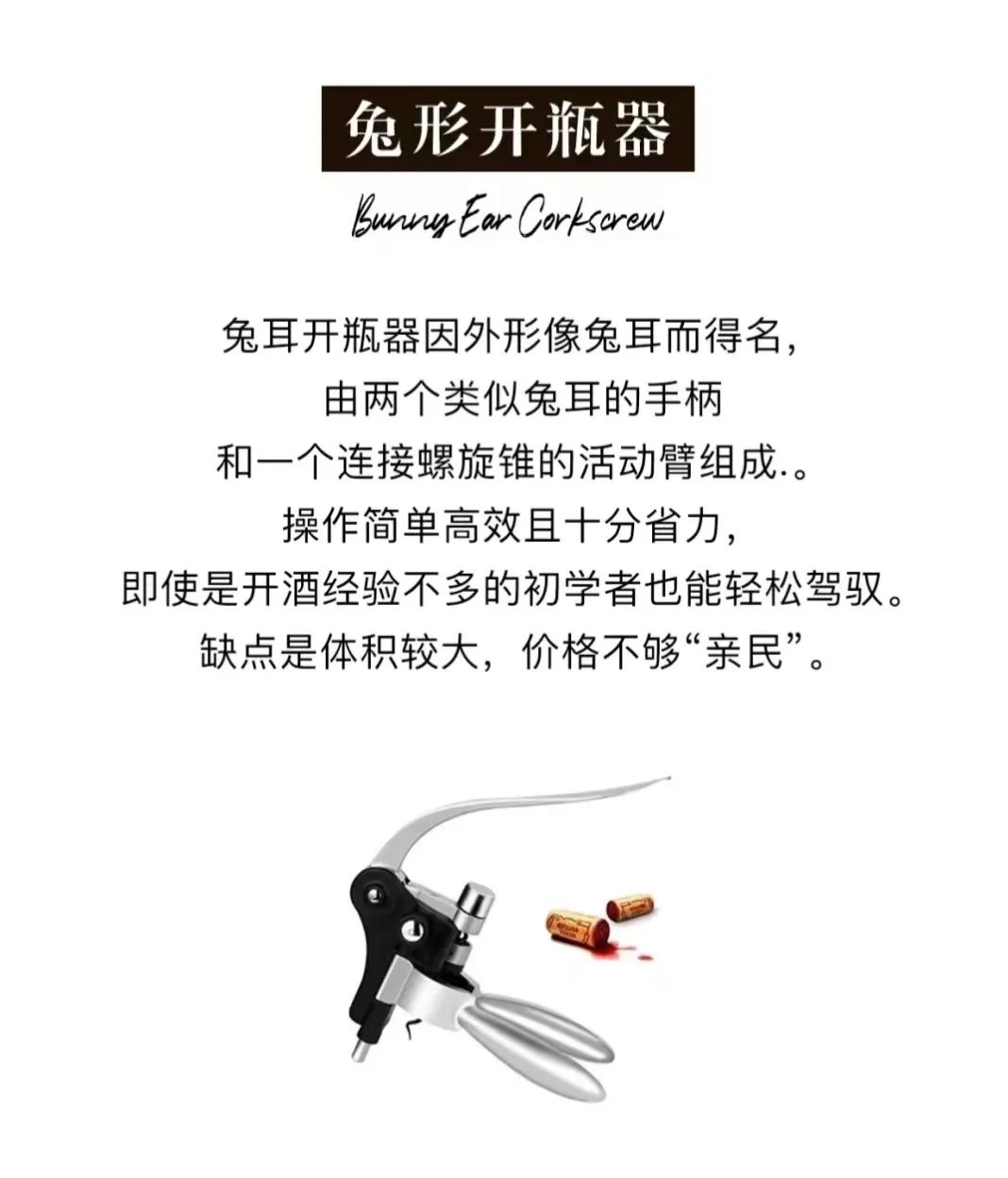 兔头开瓶器同样利用杠杆原理,有利于初学者的常见葡萄酒开瓶器。几乎不用担心会开瓶失败、出现断塞。不过因为形状和大小的问题,一般需要专门的盒子放置,不太方便携带,而且价格相对高一些哦!