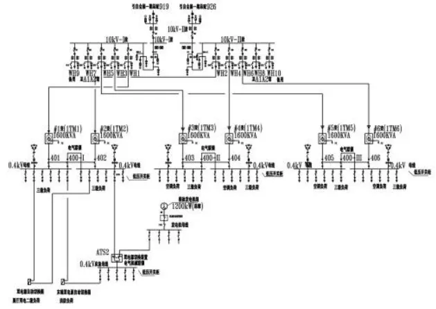 电气主接线示意图见图1。图中,变压器分列运行,进线开关和联络开关互锁,保证进线开关和联络开关不同时处于合闸位置;ATS双电源切换装置要求电气及机械互锁,自投自复,紧急时可手动操作;只有1TM1、1TM2变压器进线主开关同时断开,发电机才能自启动,在30s内投入运行。
