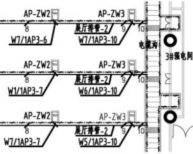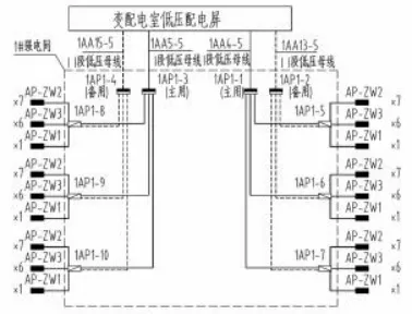 在1展厅1层设置1#和3#强电间,在2展厅1层设置2#和4#强电间。现以1#强电间配电做法(见图3)为例,在1#强电间设置4个展位箱总配1AP1-1~1AP1-4(其中2个常用、2个备用),其电源分别直接从1TM1、1TM2变压器的低压配电柜不同母线段引入,1AP1-1~1AP1-4展位总箱分别以放射式供电方式分3路供给双电源切换展位总箱1AP1-5~1AP1-10;双电源切换展位总箱1AP1-5~1AP1-10以放射式供电方式给末端的展位箱AP-ZW1、AP-ZW2、AP-ZW3;其他展厅2#~4#强电间做法同1#强电间。