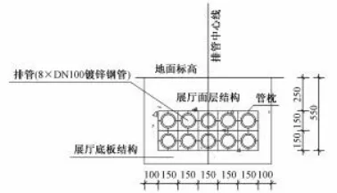 展厅沿横向展位箱分别设置20趟展位配电排管,展位配电排管分别与展厅的纵向电缆沟连通,排管沿着横向布置的展位箱馈线,展厅排管断面图见图5。