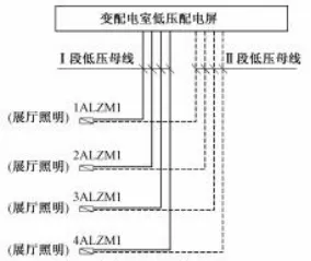 在1#~4#强电间各设一个展厅照明用ATS配电箱1ALZM1~1ALZM4,配电箱电源直接由1TM1、1TM2变压器以放射式供电方式给展厅每个普通照明回路供电,其中,每个照明回路均接入i-BUS智能照明控制系统。展厅照明配电箱配电干线见图6。