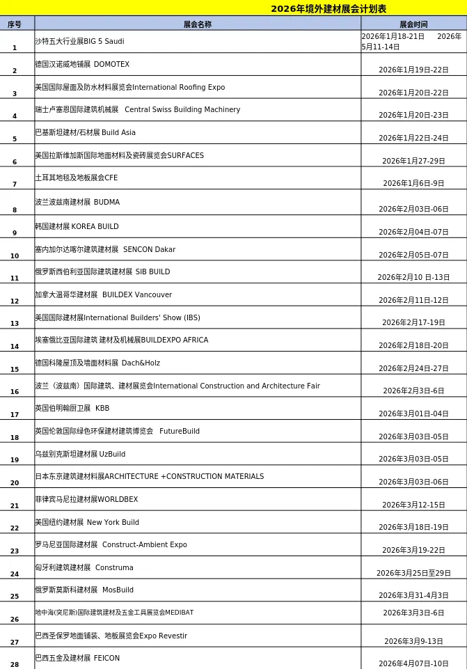 2026年境外建材展会计划表