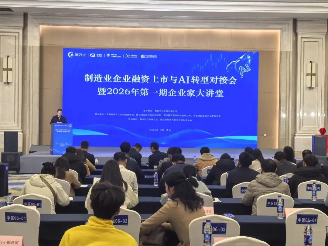 为进一步畅通资本市场服务实体经济通道,推动人工智能技术与制造业深度融合,3月20日下午,制造业企业融资上市与AI转型对接会暨2026年第一期企业家大讲堂活动在西海岸新区成功举办。活动由青岛市工业和信息化局主办,西海岸新区工业和信息化局、唐岛湾金融科创区指挥部、青岛檬豆网络科技有限公司、中信建投证券青岛企业家办公室承办,青岛市企业联合会、青岛市股权与创业投资行业协会协办。青岛市工业和信息化局有关领导,唐岛湾金融科创区指挥部、各区市工信主管部门有关负责人,制造业企业代表,银行、券商、会计师事务所等服务机构代表共120余人参加活动。