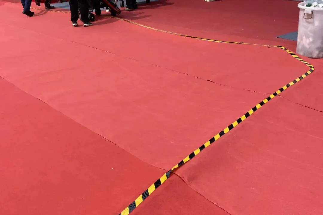 展会的地板有不少不平、凸起的地方,走路的时候很容易绊倒,好在工作人员后来发现了这个问题,及时贴上了提示警示条。