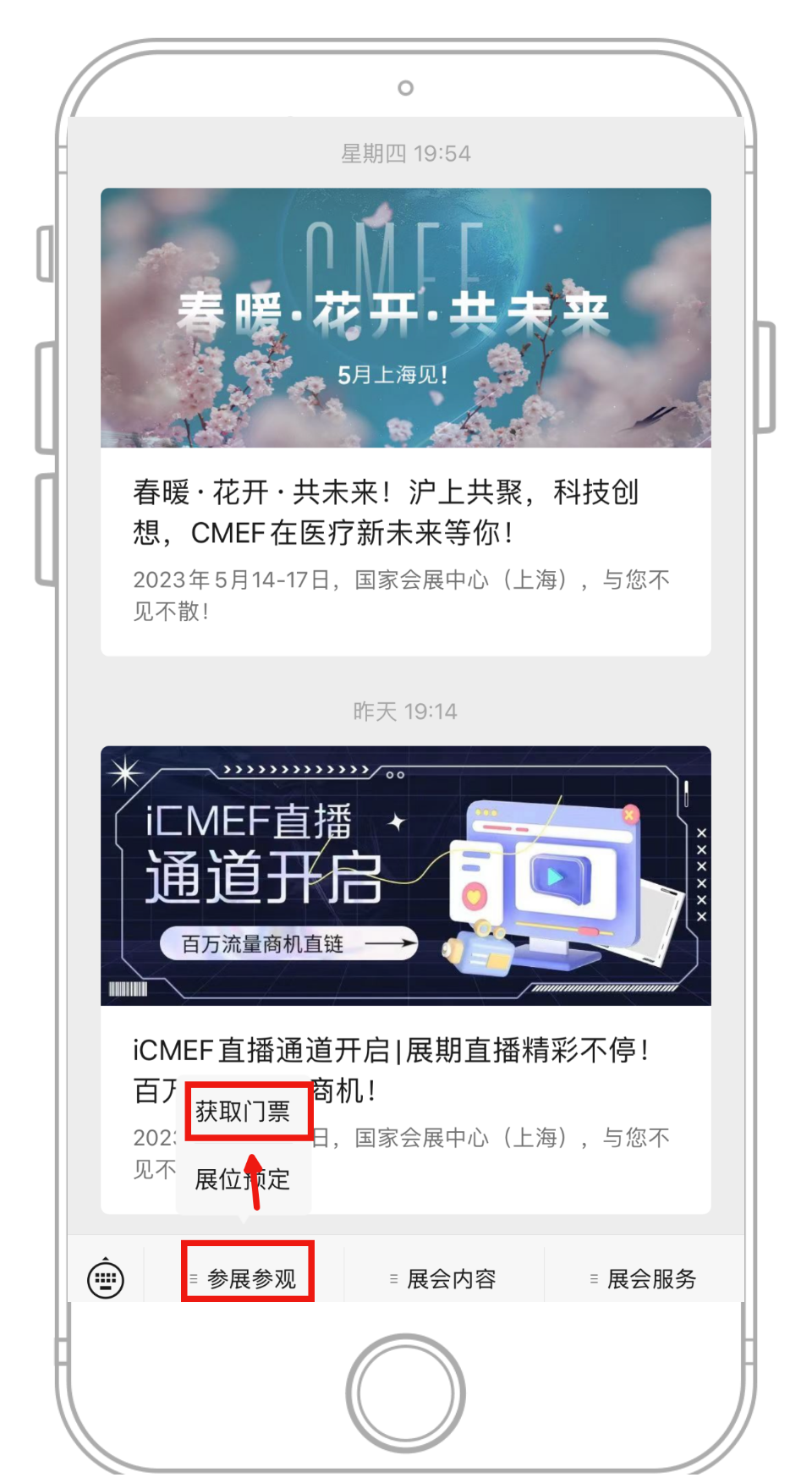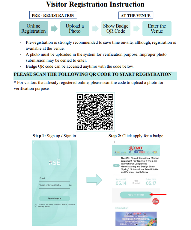 扫描预登记二维码或关注CMEF官微点击[获取门票]后点击[申请入场券]