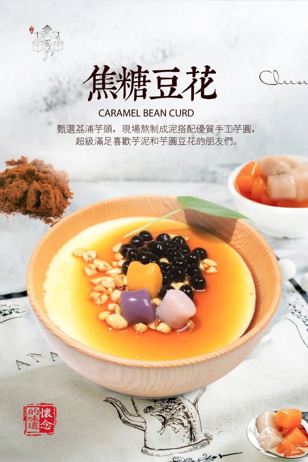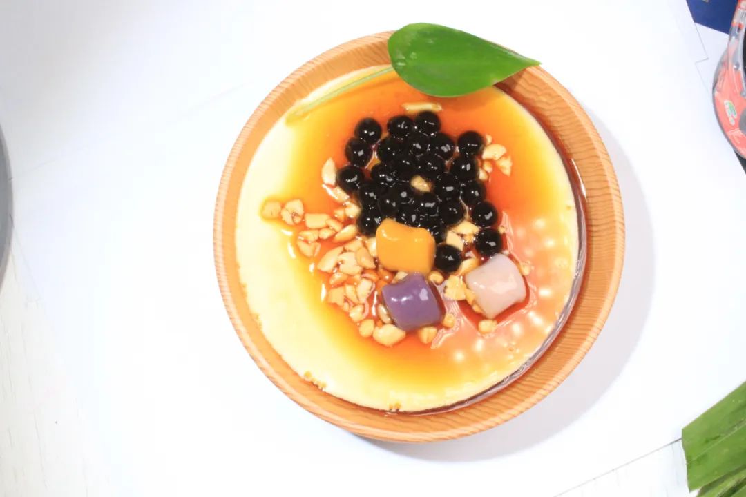 ⚫焦糖豆花搭配芋圆、珍珠、椰果、冰淇淋球、奶茶等,做成甜品;