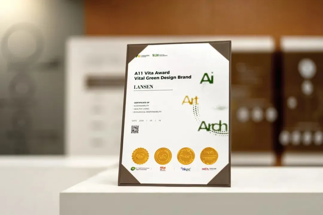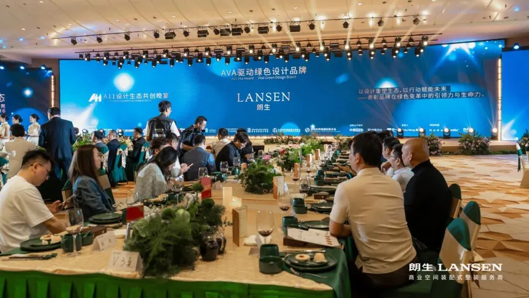盛会之余,温情相聚。朗生应邀参加A11展会晚宴,与众行业同仁围席而坐,共商共建。晚宴之上,荣耀颁奖环节备受瞩目——朗生凭借在绿色环保领域的长期坚守与可持续空间营建的务实行动,荣膺“A11 Vita Award Vital Green Design Brand”(A11维塔奖 生命绿色设计品牌),以实力斩获行业认可。