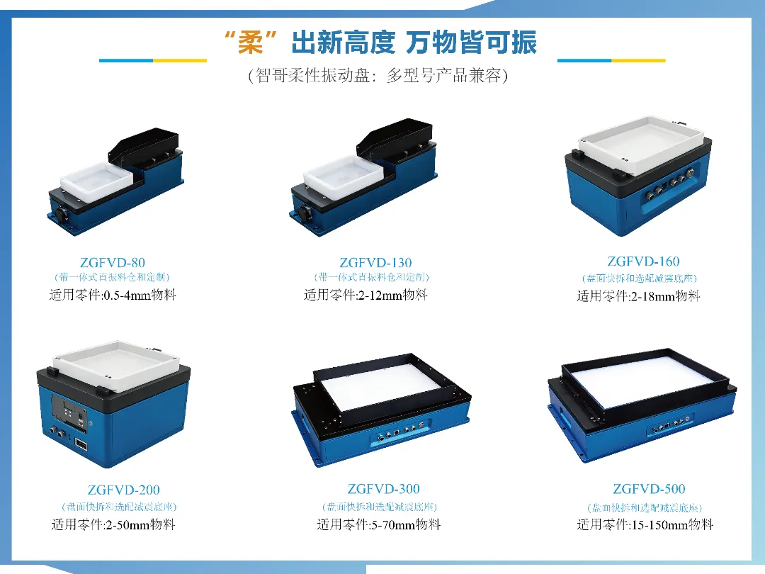 智哥柔性振动盘操作简单,具备超强的产品兼容性、稳定性和可重复性;通用性广,适用于工 业自动化生产中99%的小型零部件散料排列上料,包括异形零部件及精细易损伤零部件;多达14种运动模 式,覆盖视觉上料应用所有振动需要。 无需更换硬件结构快速切换生产品种,程序一键切换生产品种,迎合当前智能制造小批量、多品种的 柔性生产需要。