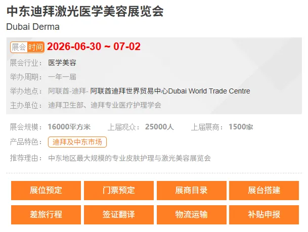 [展位预定、门票预定、展商目录、展台搭建、差旅行程、签证、翻译、物流运输、补贴申报]