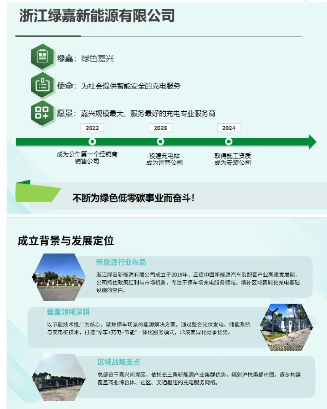 浙江绿嘉新能源有限公司作为公牛安全充电桩在嘉兴市场的总经销,成立于2018年1月,注册资本金4100万元,员工40多名,拥有电力工程施工总承包贰级、承装(修、试)类三级电力设施许可证资质、施工劳务资质,是公牛安全充电桩嘉兴总经销商,主专业从事新能源充电桩、储能、光伏的销售、安装、运营及运维等服务,致力于成为华东地区有影响力的充电桩专业服务商,目前已完成新能源安装项目300多座,如南湖天地、世合大厦、桐乡市委党校、桐乡金融商务区、南湖法院、新塍党史陈列馆、乌镇互联网培训中心、平湖艾地盟等(详见浙江绿嘉新能源小程序);投建小区和社会停车场200多个,已和绿地、绿城、世茂、佳源、大树、宜居、瑞源、信达、嘉环等100多个物业公司、商业中心、酒店达成战略合作,2024年充电桩产值达到1736万元,是嘉兴地区服务领先的新能源专业服务商。已建成一支由40多位工程、运维人员等组成的运营服务团队。和嘉兴交投恒创特来电和嘉兴市经慧新能源有限公司,嘉兴市湾北新能源有限公司等多家政企单位达成深度合作完成公交充电站,公快充电站及小区充电站40多个,积极贯彻落实了习近平生态文明思想和党中央国务院关于绿色发展和生态文明建设的要求,共同推进新能源汽车以及充电基础设施产业的发展,彰显企业品牌形象和使命担当。