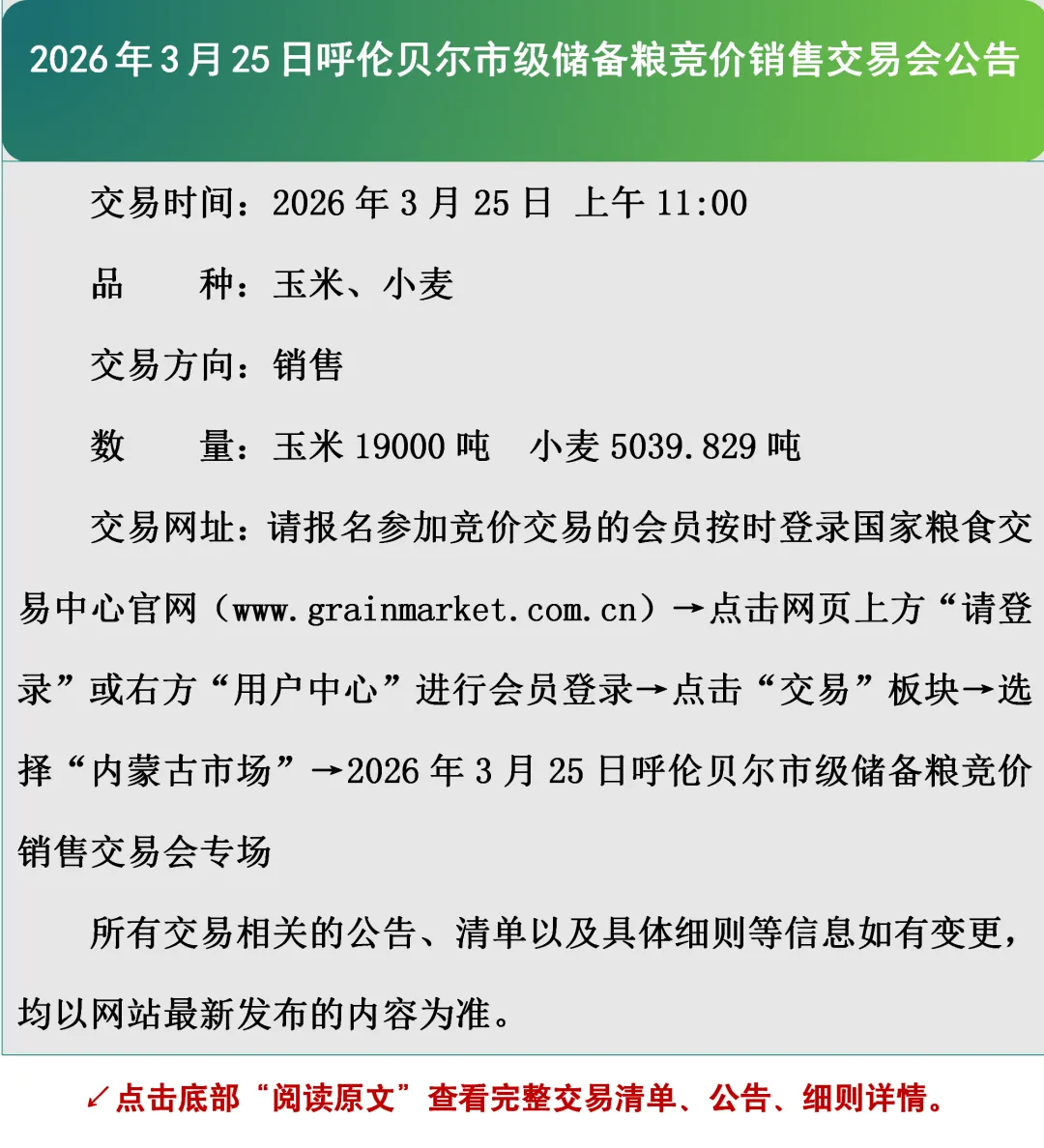 2026年3月25日呼伦贝尔市级储备粮竞价销售交易会公告
