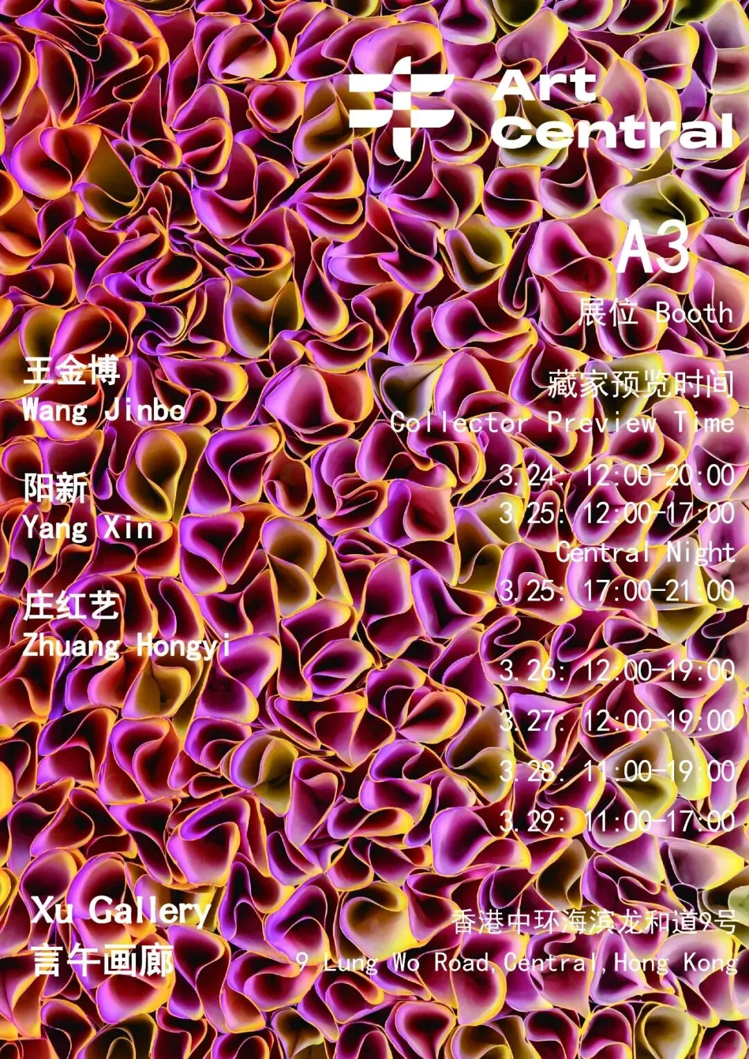 言午画廊荣幸宣布参加2026香港Art Central展会,并于3月24日至29日A3展位展出艺术家王金博、阳新和庄红艺的绘画、雕塑和综合材料等作品。