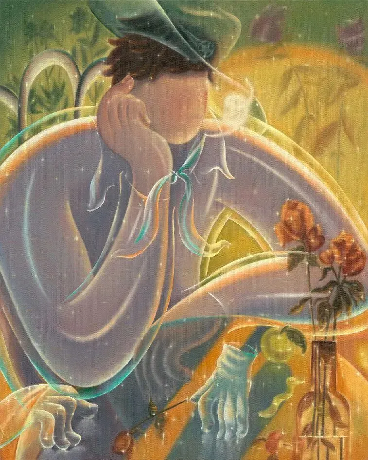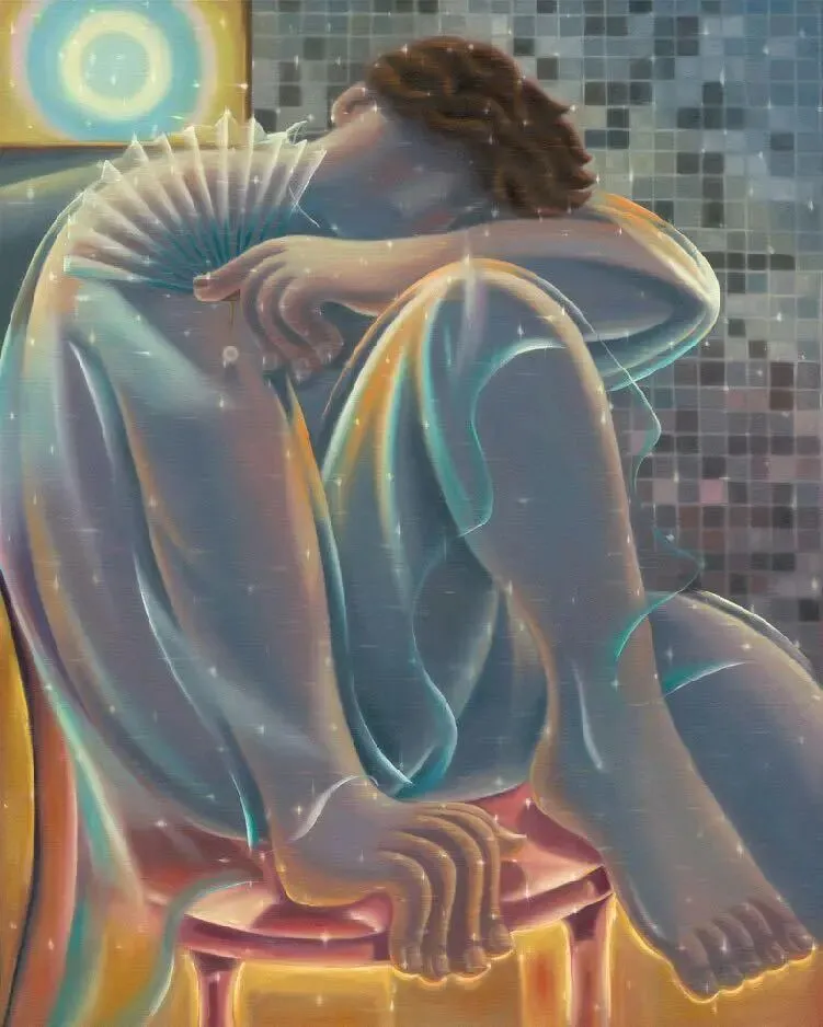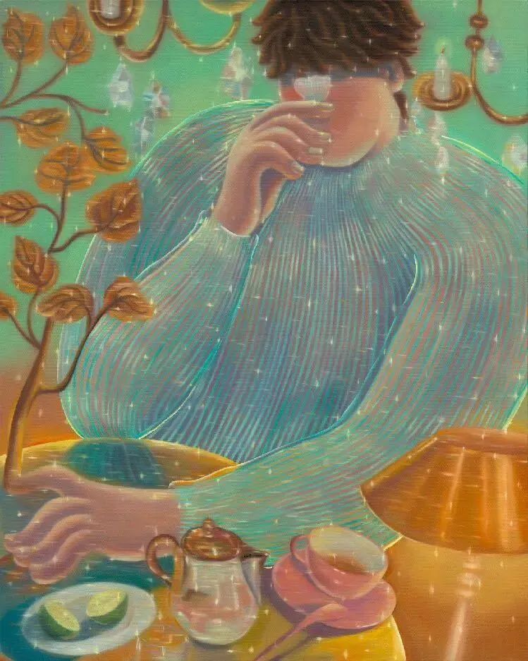 王金博2020 年硕士毕业于四川美术学院造型艺术学院油画专业。闪耀的光芒是王金博独特的艺术语言,表达他自己或当代人内心对社交的深层恐惧。人物动作的变形一直是他探索和发现自我的艺术体现,它们委婉且略显扭捏,试图找到和自己相处时最舒适的状态。艺术家通过社会现状,思考人类的性格和属性,去探索自己的内心,获得自洽。希望观者能感受到一种舒适的安全感和温暖的慰藉,找到属于自己的自洽。