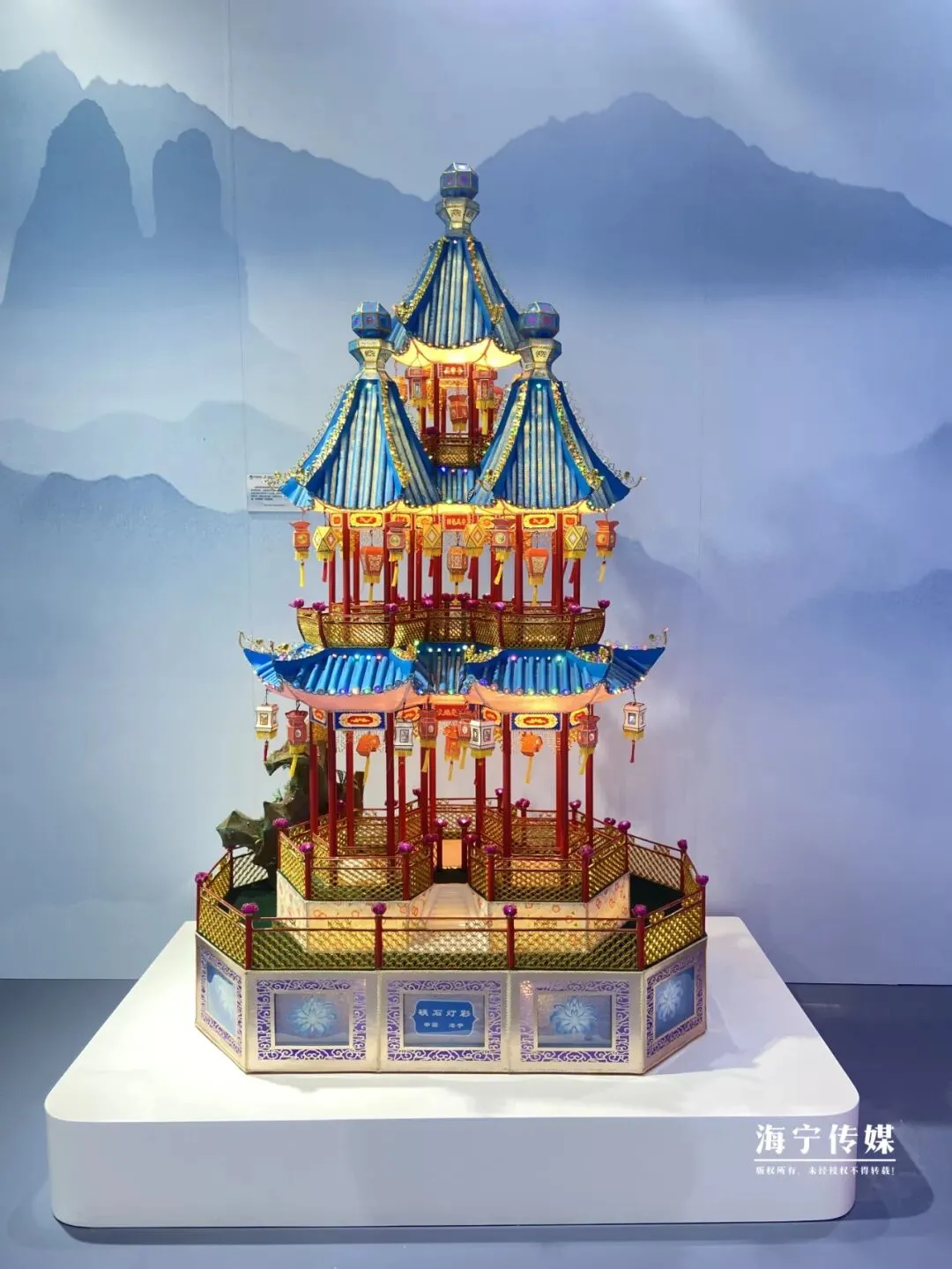 硖石灯彩始于唐盛于宋,是首批国家级非物质文化遗产代表作名录。其制作精细入微、富有诗情画意,集“针、拗、结、扎、刻、画、糊、裱”八大传统工艺于一体,尤以针工细密的“万眼罗”最奇,享有“轻罗万眼竞光辉”的美誉。此次共展出《采莲船》《品字亭》《茶壶灯》《球形宫灯》《针刺灯片》等作品30余件,这些作品华丽秀美、玲珑剔透,点亮了整个浙江展区。