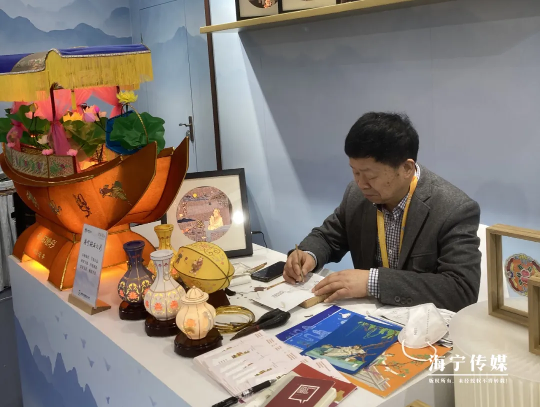 国家级传承人胡金龙一边展示针刺工艺,一边向观众介绍硖石灯彩的特色:“《品字亭》是以它的结构形状来命名的大型硖石灯彩,三座亭呈‘品’字状,整座灯布满了针孔约300万个,内配荷花灯、球形宫灯81盏,微型小灯1200颗,耗时500余个工作日,是硖石灯彩传统工艺的集中体现。”观众们被巧夺天工的技艺所惊叹,赞美之声此起彼伏。除了大型灯彩,典雅的针刺灯片则是“针刺工艺”和“绘画工艺”的完美呈现,细看之下,仿佛亲临一个个历史故事、神话传说之中,给观众带来视觉享受的同时,也传递了中国传统的优秀文化。