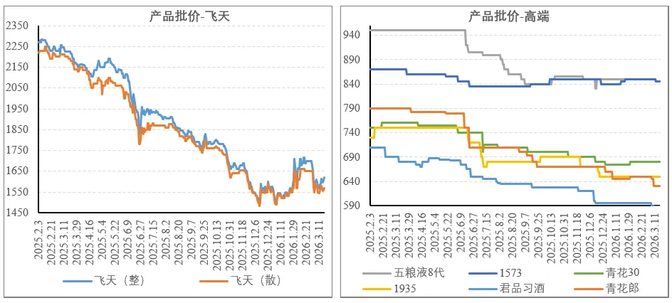 但中高端普遍承压,尤其酱酒如君品习酒、青花郎等在茅台1935冲击下一路走低。