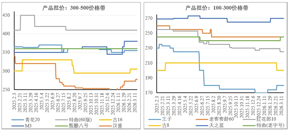 300-500以及300以下大众价格带相对平稳,青花20、古16、天之蓝、特曲(老字号)等最近有小幅涨价,或反应了库存在春节有所去化、而今年打款和补库节奏相对较慢的影响,向后看价格能否稳住还需观察。