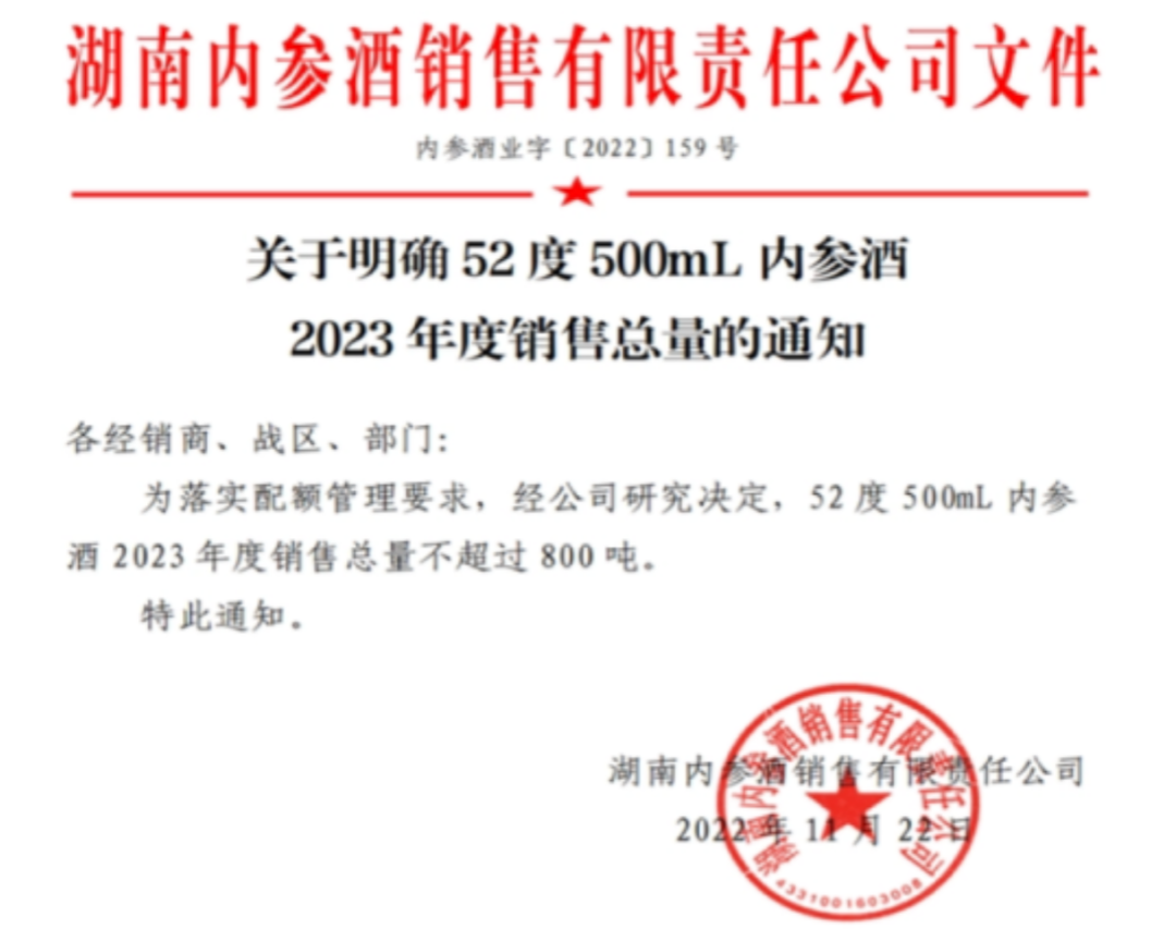公司在2022年11月发布的《关于明确52度500ml内参酒2023年度销售总量的通知》中,就已经明确表示“52度500ml内参酒2023年度销售总量不超过800吨”。要知道,2022年内参酒的总计销量是1147吨,主要就是靠52度500ml内参酒完成的,2023年控制在不超过800吨,对酒鬼酒公司来说,就等于确定了今年销售业绩不会再重现过去几年的高歌猛进了。