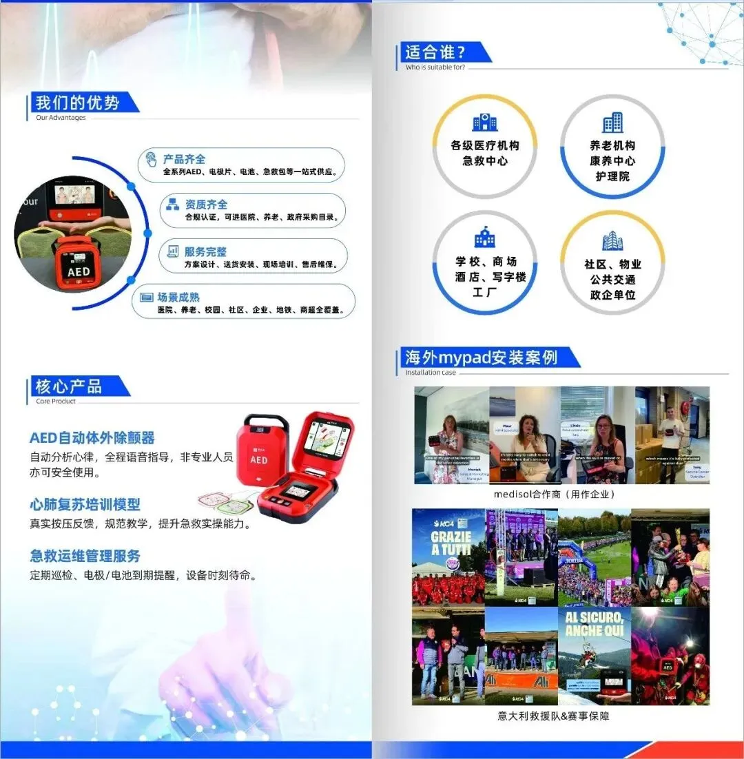 1. 急救设备全链条解决方案:围绕AED(自动体外除颤器)的配置、运维与培训,呈现从设备选型、安装调试到接入市级管理平台的一体化服务,呼应成都“AED生命守护网”建设需求,助力城市急救体系完善。