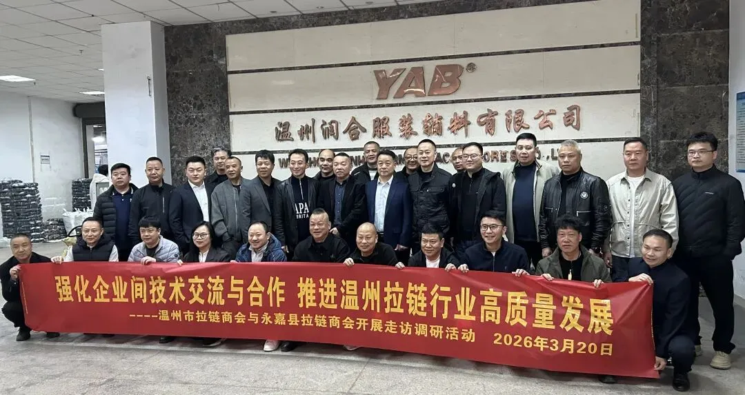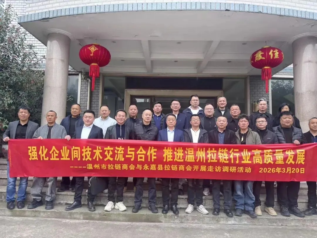 2026年3月20日,永嘉县拉链商会理事会赴温州市拉链商会与行业企业开展交流活动,本次活动由本商会会长詹天祥、秘书长刘金龙带队,39位理事参加活动;温州拉链商会会长叶加林、老会长杨育才、秘书长黄凌云、监事长江连岳等领导全程陪同。