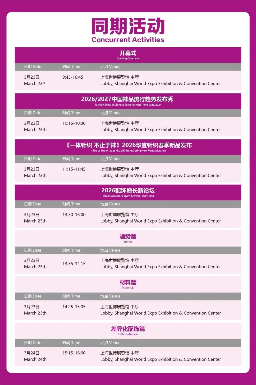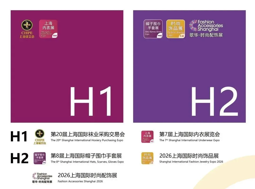 本届展会将继续携手第20届上海国际袜业采购交易会CHPE、第2届上海国际时尚饰品展FJE、第8届上海国际帽子围巾手套展HSGE这3个上海国际时尚配饰展中的系列展同期召开。2026年展会总面积将达到5万平米,2大展馆汇聚近1000+家展商,一站式打通内衣、袜子、帽子、帽饰、围巾、丝巾、披肩、手套、发饰、手饰、项饰、耳饰等多个行业及产业链,届时本届展会将用多样化的时尚细分市场进行联动,共同打造了一场规模宏大内容丰富的流行配饰行业盛宴。