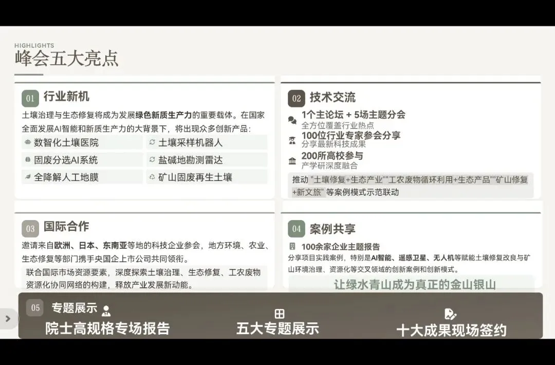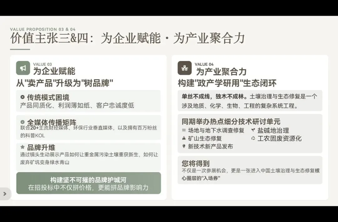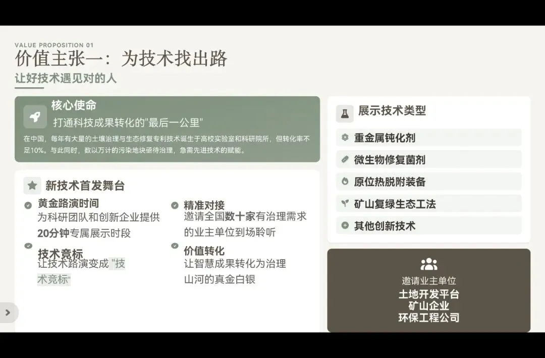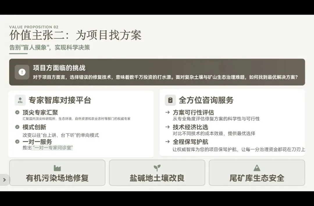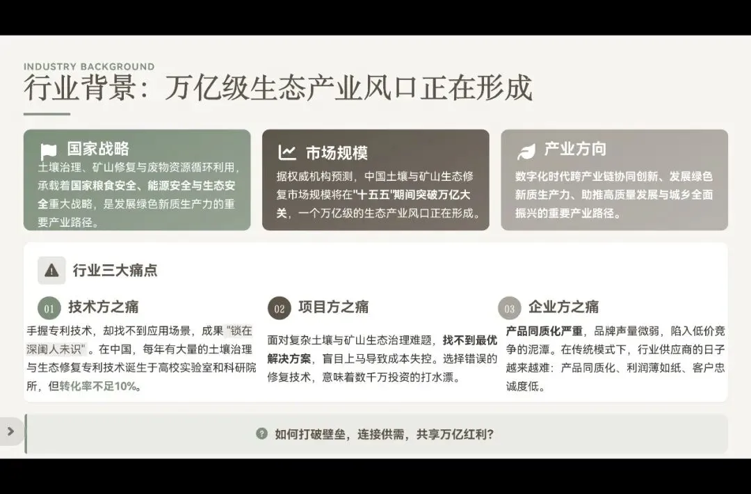 土盟以各级地方政府、央国企和产业链主单位为主要服务客户,业务聚焦“全域土地综合整治,污染场地(地下水)修复,矿区生态修复和固废资源化,高标准农田建设,盐碱地、荒漠化土地、废弃地的土壤改良和产业运营、生物基材料、碳汇开发和碳资产销售等”,目标是为客户实现产业升级、乡村振兴、生态产品价值实现、社会经济可持续发展。土盟以“土壤治理生态修复+可持续开发+产业运营”的发展理念,依托土盟十年累积的专家智库、企业集群、产业资源,能够①为央国企和链主单位提供链接各地政府资源、提供“土地价值重构全过程咨询服务”,为民营科技企业提供更多市场及投融资机会,帮助企业做大做强;②为地方政府和各类客户提供“以土地综合整治和生态修复”为主题方向的项目可研报告、投融资设计方案、产业导入建议方案等咨询服务;③为地方政府和各类客户申请各项土壤环境治理与生态修复的专项资金;为地方政府及各类客户设计环境修复与乡村振兴等各类专项债等,并协助地方政府及其平台企业向国家相关主管部门申报;④为地方政府招商引资,引入生态治理、环境修复、土壤改良、碳汇设计、农林废物资源化和高值化利用龙头企业,帮助地方政府产业转型升级。土盟简介