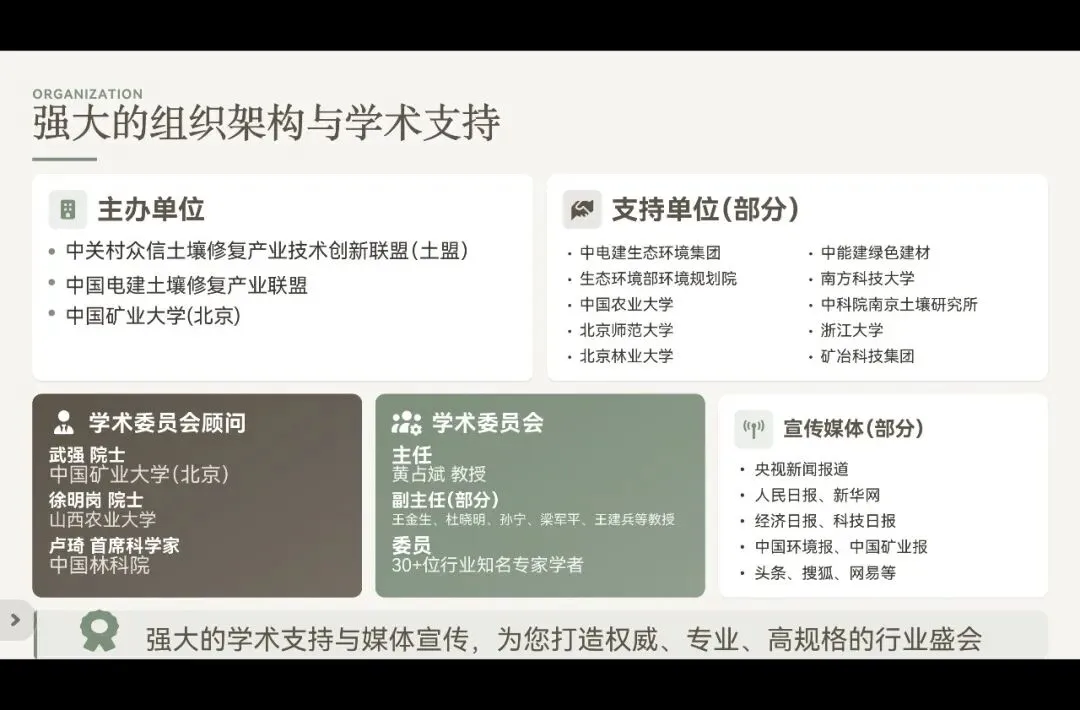 中关村众信土壤修复产业技术创新联盟(行业简称“土盟”),是土壤治理与生态修复行业权威的产业技术集群平台,致力于搭建以“土壤治理、生态修复和废物资源化”为核心业务的专家智库组织和产业技术成果转化平台。目前为土壤环境与生态修复领域3000+企业、160 所全国相关专业高校、1500 位高校专家提供标准、产学研、政策、课题等服务,并长期合作。全国会员单位超过300家、入库专家团队成员500位。上级业务指导单位为北京市科委、中关村科技园区管理委员会。土盟由中国矿业大学(北京)、中国地质科学院矿产资源研究所、北京市科学技术研究院资源环境所(原轻工业环境保护研究所)、北京师范大学地下水污染控制与修复教育部工程研究中心、矿冶科技集团有限公司、中节能、高能环境等业内具有代表性的30余家企事业单位联合发起成立。土盟致力于搭建基于土地价值重构的产业技术咨询服务平台,倡导“土地绿色修复+可持续开发”的发展理念,服务范围涵盖了农田土壤改良、工业场地及地下水修复、矿区、油田及周边土壤修复、流域及河道底泥治理、盐碱地及荒漠化土地整治、工农废物综合利用等土壤治理与生态修复相关的各个领域。土盟业务