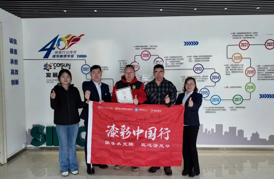 3月19日,漆彩中国行走进超前涂料,广州设计周涂料产地服务中心负责人、佛山市涂料行业协会秘书长、瞰涂说话总编兼漆彩中国主编语飞来,顺德涂料商会副秘书长陈越,为超前涂料颁发2026漆彩中国整装美学首选仿石涂料品牌。