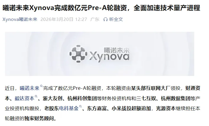 据悉,本次曦诺未来完成的数亿元融资,由某头部互联网大厂领投,财通资本、毅达资本、浙大友创、杭州科创集团、三七互娱、杭州数据集团等机构联合跟投,电科基金、东方嘉富、小米战投等老股东继续追加投资,形成产业资本与财务资本协同布局的格局。