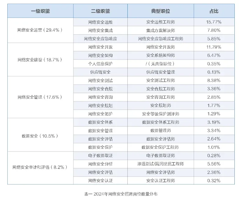 在工作类别上,安全运维工程师、网络安全开发师、安全测试工程师、集成方案解决师、安全系统架构师、渗透测试/漏洞挖掘工程师等招聘职位多,占比较高。