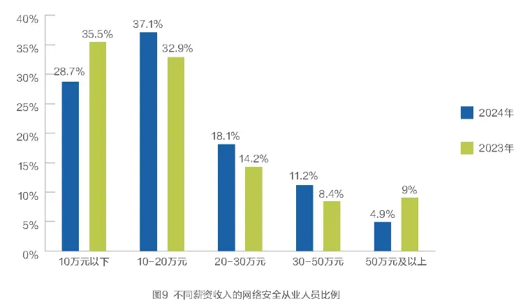 网络安全从业人员的薪资水平普遍较高。根据《2024年网络安全产业人才发展报告》,调研数据显示,受访者中,有37.1%的网络安全从业人员2024年的年薪资在10-20万之间,18.1%在20-30万之间,11.2%在30-50万之间,4.9%在50万以上。