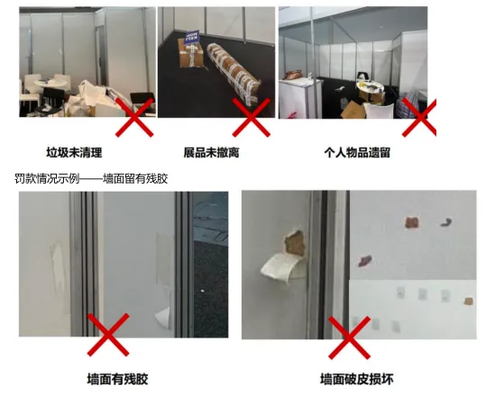 4、展位清洁要求:罚款情况示例——地面未完全清理(布撤展期间,除了展位内部的清洁,展位外的过道及其他展览区域都不能堆放垃圾。咨询场馆工作人员将垃圾放在指定垃圾桶,放不下建议自己带出场馆处理,或者购买垃圾清理服务)