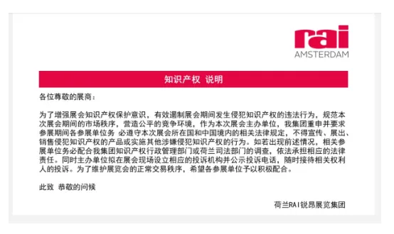最后,我司诚挚提醒各位参展商,请仔细查阅 Interclean Amsterdam 2026 荷兰阿姆斯特丹国际清洁与维护展览会参展规则,禁止展示涉嫌侵权的产品、包装和其他相关材料。如历年展会上发生类似情况,主办方 RAI Amsterdam 将不得不采取撤销展位及撤除涉嫌产品/包装/材料的措施。请知悉。