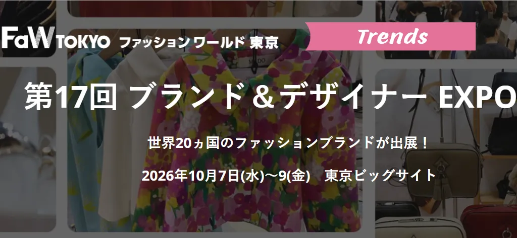 日本规模最大的时尚展——日本东京时尚流行成衣服装服饰,箱包,鞋类,饰品配件,布料辅料海外面料,时尚科技相关产品展览会FASHION WORLD TOKYO ( FaW TOKYO ),秋季展将于2026年10月7-9日在东京国际展览中心(Tokyo Big Sight)隆重举办!共计世界36国 1100社出展!日本最大のファッション展!东京时尚产业展!
