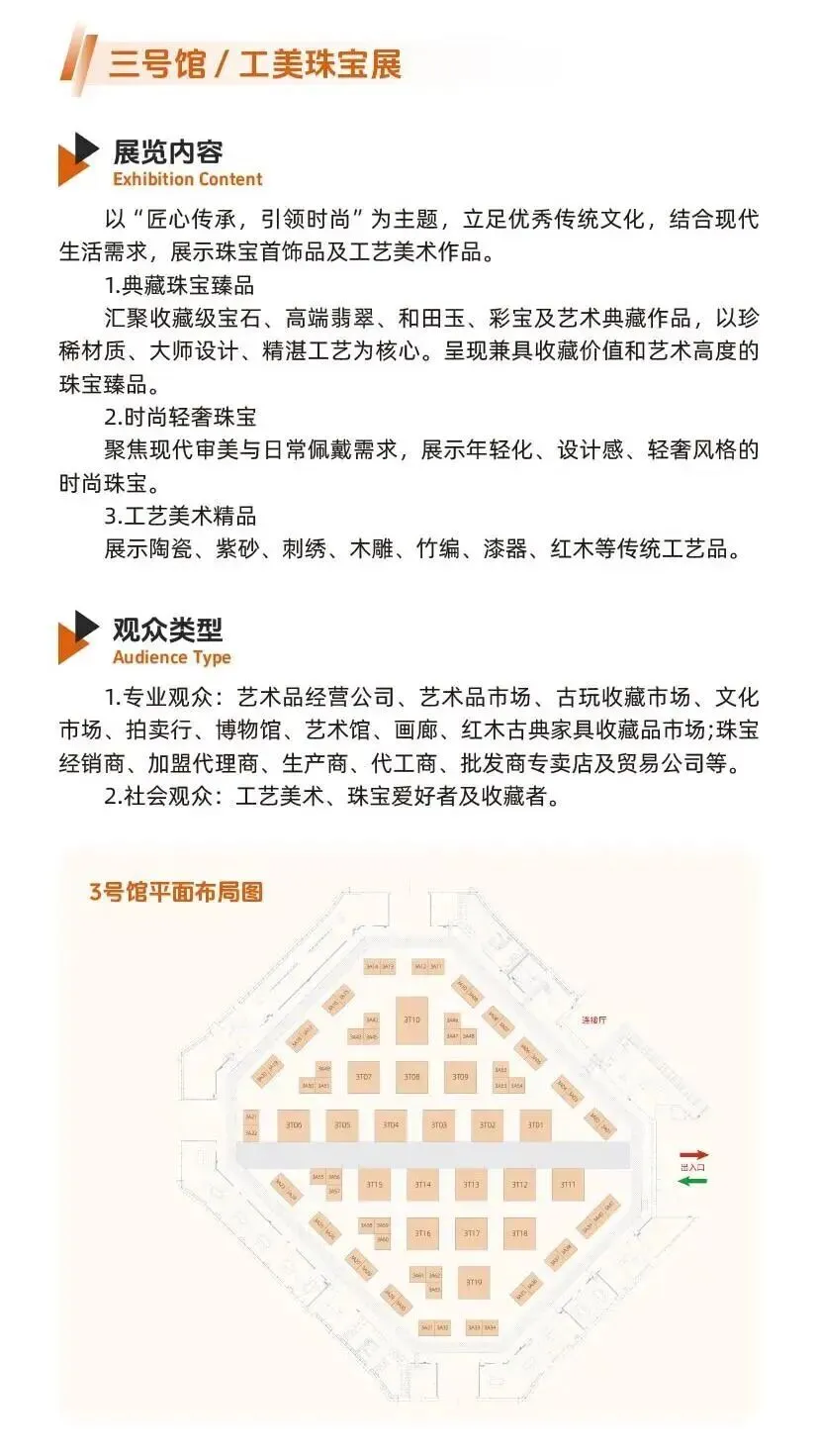 3号馆 • 工美珠宝展:展示珠宝玉石、陶瓷、紫砂、刺绣等工艺美术精品,吸引艺术品经营机构、珠宝经销商、工艺收藏爱好者等专业与社会观众。