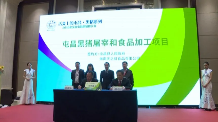 在现场签约仪式上,县政府分别与海南罗牛山腾昌生态黑猪有限公司、屯昌天之虹生态农牧有限公司、海南天之虹食品有限公司成功签约4个屯昌黑猪产业项目:罗牛山屯昌现代循环农业示范基地项目、屯昌天之虹南坤种猪场项目、屯昌黑猪屠宰和食品加工项目、屯昌天之虹·京东农牧战略合作项目。