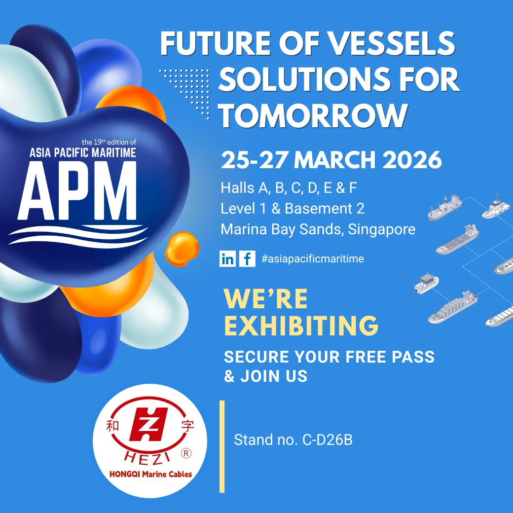 亲爱的行业伙伴、新老客户: Dear Industry Partners, New and Valued Customers, 我们即将启程狮城新加坡,参加第 19 届亚太海事展(APM 2026),与全球海事同仁共探船舶未来! We are heading to the Lion City, Singapore, to participate in the 19th Asia Pacific Maritime (APM 2026), where we will explore the future of vessels with global maritime professionals! 扬州市红旗电缆制造有限公司(和字牌 HONGQI Marine Cables)将携符合国际船级社标准的船用电力 / 控制 / 通信电缆,以及新能源船舶、智能船舶定制化线缆方案亮相,现场资深团队将为您提供一对一咨询服务。 Yangzhou Hongqi Cable Manufacturing Co., Ltd. (HEZI Brand, HONGQI Marine Cables) will showcase our marine power, control, and communication cables that meet international classification society standards, as well as customized cable solutions for new energy vessels and smart ships. Our senior technical and commercial team will be on hand to provide one-on-one consulting services. 诚邀您莅临展位 C-D26B 交流洽谈,共拓海事行业新机遇! We sincerely invite you to visit our booth C-D26B for in-depth discussions and to explore new opportunities in the maritime industry together! 展会时间:2026 年 3 月 25 日 —27 日 Date: 25–27 March 2026 展会地点:新加坡滨海湾金沙会展中心 Venue: Marina Bay Sands, Singapore 展位号:C-D26B Booth: C-D26B |