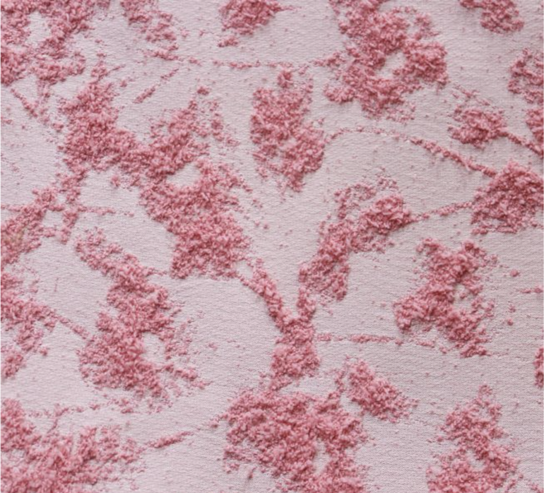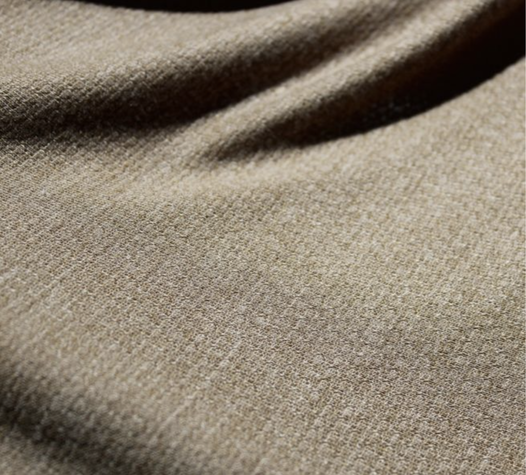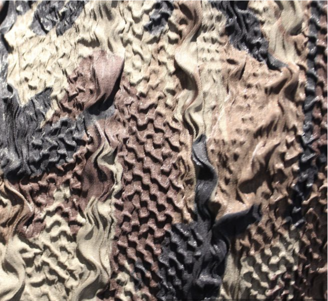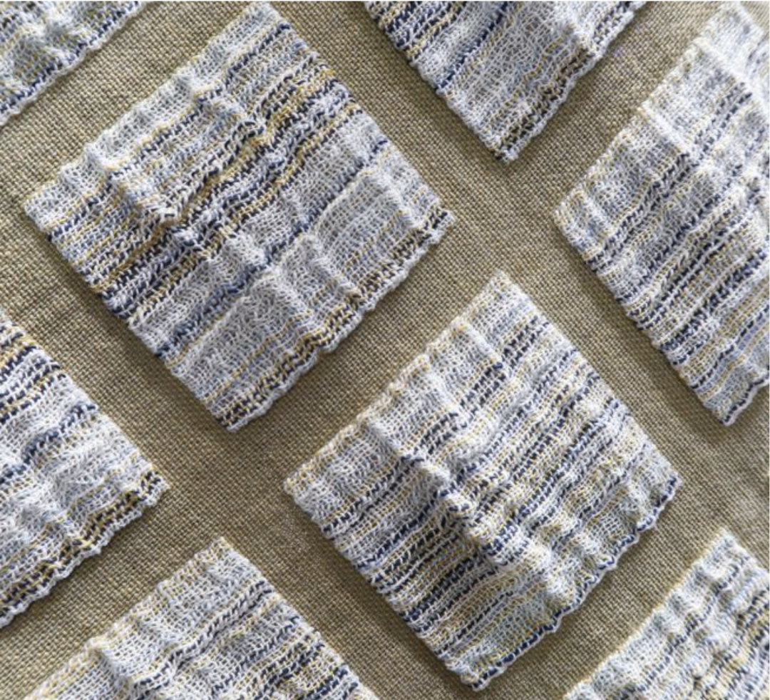 运用纱线和结构打造不规则的起皱及回缩纹理,并通过特殊整理增强色彩、光泽和纹理效果,使织物达到具有自然感的纹理。