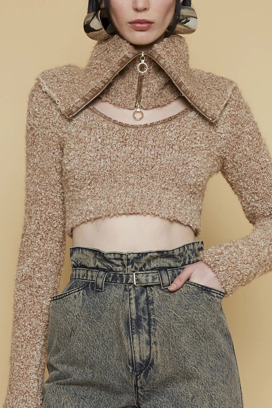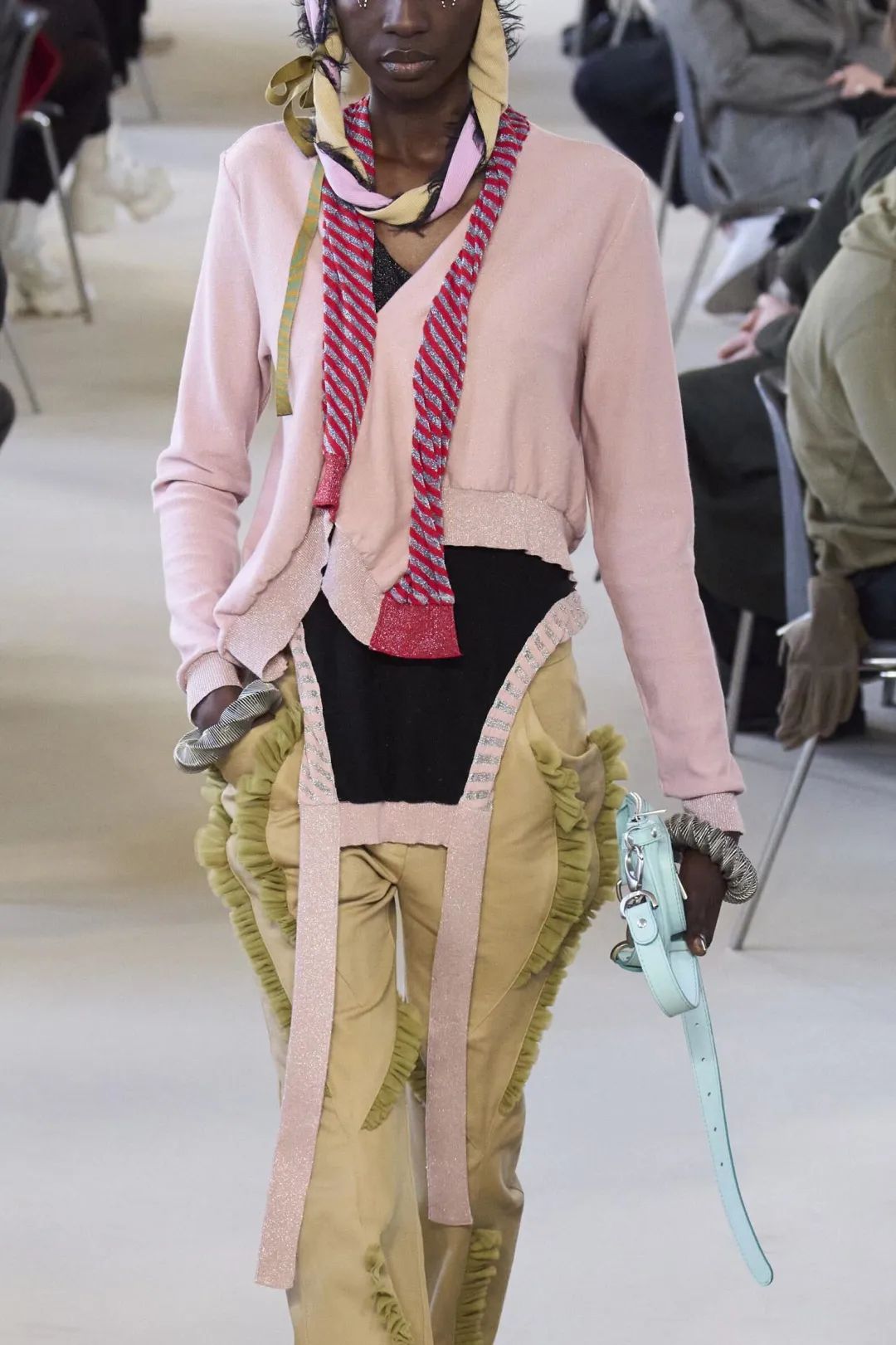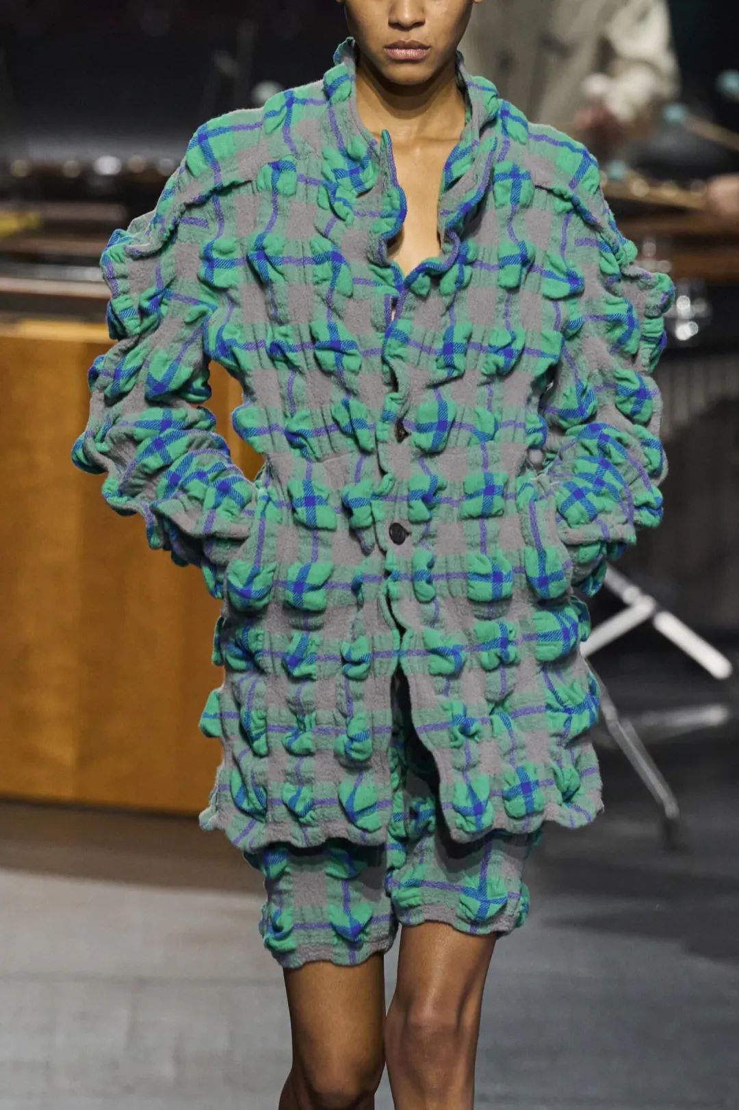 使用色彩饱和度较低的纱线和编织纹理,让面料带有了夏日的感觉。错落相间的排布顺序与手织的效果叠加在一起,为服装带来呼吸感的清爽。